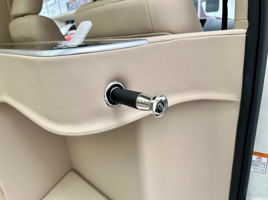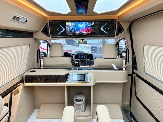 这款车做的是半隔断7座的布局,当然还可以做全隔断的,或者无隔断的布局,从6座到13座都可以,还能做成带卫生间的布局。本隔断的话比较通透敞亮,还多了一些配置,比如热水壶就有了,当然,喜欢喝茶的话,半隔断的吧台可以做一个茶台,用处多多。隔断侧方还额外增加了雨伞架,车上车下,皆可以遮风挡雨。