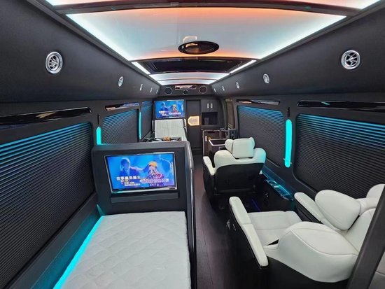 再来看一下商务款的布局,作为商务用途的车辆,12座是最受欢迎的款式。既能保证空间性,也可以保证整体的舒适性,和出行的人数。也是全隔断的布局,有两个反向座椅,大屏的电视机,卡拉OK的功能全部具备,还能商务会议。作为商务款,主要作用就是接待用车,企业招待,自己出行的高规格配置,走在路上也是炸裂的存在。配置高,款式好,整车都是真皮包覆,侧墙每个作为都是有无线充电和五孔的插座。