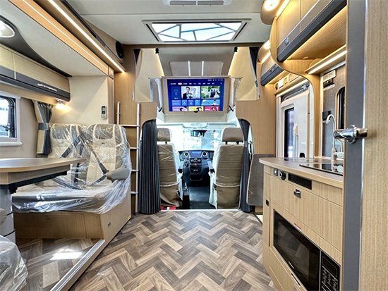 来到车内,我们可以看到,V820采用双拓结构,即房车左侧与车尾均配置空间拓展机构,这样,驻车时的布局和人员流动并不会显得太过于拥挤,车内空间实现最大化,全车车内采用E0级环保标准房车家具板材,配色上更为高级,深色系选材质感十足,额头双人床周边配有对立式车窗和顶置天窗,通风采光性都很不错,隐私床帘可保证床铺私密性,底部为隐藏式40寸互联网液晶电视,电视与室内JBL环绕立体声音响系统匹配链接使用,娱乐影音全互动,增加户外生活体验。给人的第一感觉就是低调奢华有内涵,有木有!