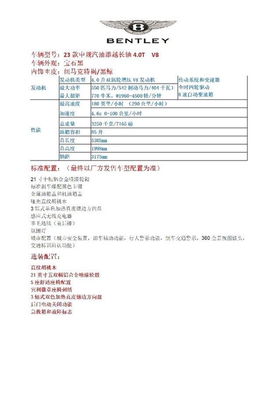 23款宾利添越长轴距版动力上,将延续4.0T V8发动机,最大马力549Ps,峰值扭矩770N·m的发动机,同时还会提供6.0T W12发动机,最大马力将达到635Ps,峰值扭矩为900N·m,贵宾购车电话:17627885113 祝经理 (微信同电话)同时新车还有望推出插电式混合动力车型,动力数据接4.0T V8发动机的燃油版车型。