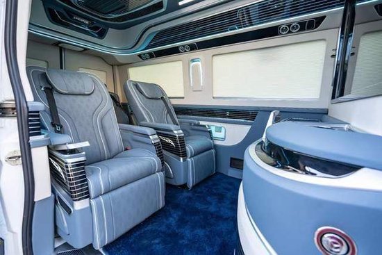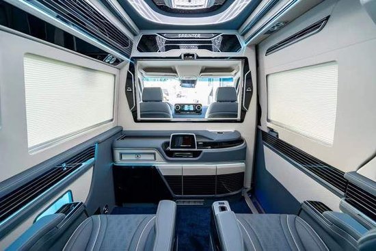 奔驰斯宾特也是怀挡的设计,驾驶室定制了一个车载冰箱,主副驾都是电动调节等等。主要还是看我们的后区乘客舱,也是大佬的专属地盘哈。前后通过中间的吧台进行了分割,前后舱可以通过通话器通话,也可以将电视屏幕降下去了直接对话,满足我们的商务接待和家庭出行多种用车环境。吧台两侧拥有两个隐藏的座椅,在城里通勤的时候可以满足多乘员的需求,长途的时候可以用于放置我们的腿部,缓解旅途的疲劳。