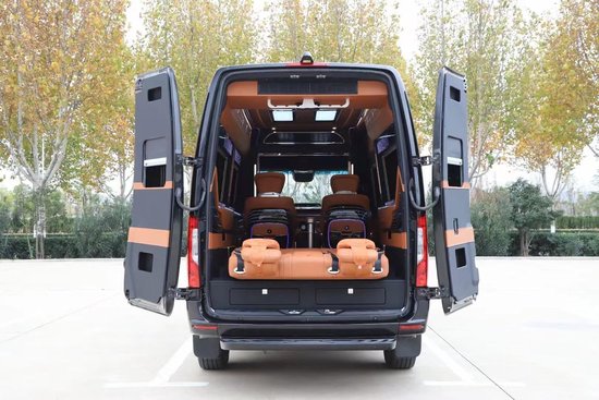 为了方便老人小孩上下车,车侧和车尾都设置了伸缩脚踏板,进入车内,以青灰色包边为主,加上米白色,整体偏冷色系,中排两把米色埃尔法同款座椅,法式线条缝合,立体感、包覆性极强。要说空间大,7座的MPV大布局,在这款车上就体现的淋漓尽致,后排是一个三体式连体沙发床,不仅如此,旁边还留有一个过道,无论你是横躺还是侧躺,都游刃有余,来去自如,更便捷。