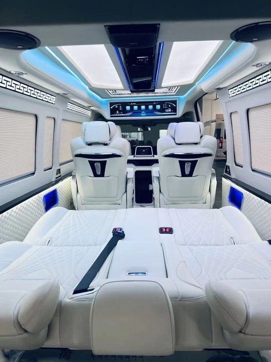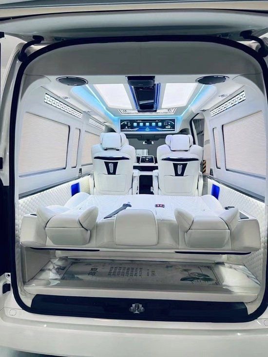 丰田海狮整车升级了加强型的隔音隔热处理,车内带空气净化系统,无线充电系统。在进门侧加装了氧化铝脚踏带迎宾灯的,华通丰业整车都是采用纳帕级皮质进行包覆的,侧壁红木装饰,手动百褶窗帘,后舱暖风系统,棚顶灯光,智能触摸控制系统。埃尔法同款独立航空座椅具备(通风,加热,腿托,旋转)等功能。