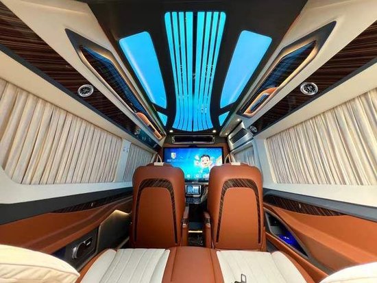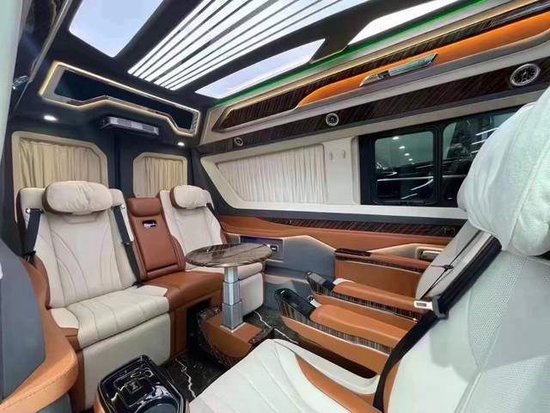 奔驰斯宾特还配备了车载电脑系统,DVD主机显示屏+环影,23升车载冰箱,卫星数字电视,全车实桃木,后舱侧玻璃开窗,全车黑色隐私玻璃,高配行车辅助(变道、行车、盲点),可拆装小桌板,前后对讲系统,全车棕色窗帘,全车220V市电,电动蹬车踏板,五方位摄像头,空气净化器,驻车暖风