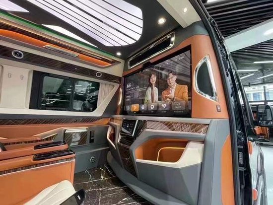 整车核载7人,驾驶舱与后面的商务舱通过隔断隔开,给后面的商务舱提供了私密空间。宽屏曲面网络电视是可以升降的,降下来之后,前后舱可以直接沟通。一体式的吧台隐藏着两个翻折式座椅,可供航空椅上的老板放脚用,也可以临时开会对坐用。对坐当然少不了收缩式的小圆桌。
