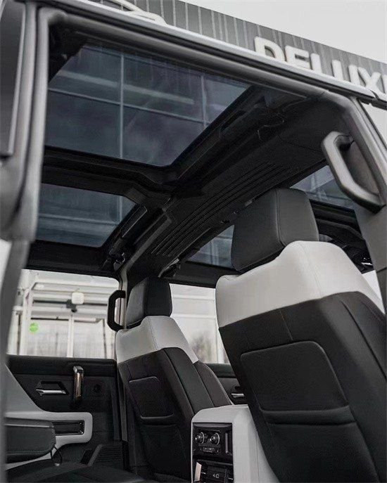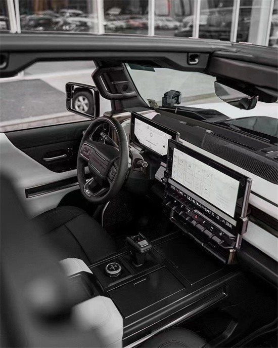 全新悍马EV车型整体沿用了 悍马H1H2H3等经典车型的设计风格,悍马家族标志性的多孔竖向格栅、进乎垂直的前风挡、车身侧面的高腰线和窄边玻璃等在一定程度上继承了此前已经停产的悍马车型的基因,搭配35英寸固特异泥地胎和可分区域移动的车顶显得非常硬派。