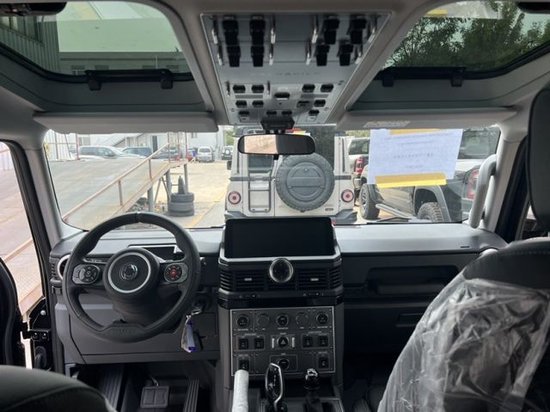英力士掷弹兵3.0内饰方面,取消了仪表盘的设计,配备12.3英寸中控大屏,下方为空调出风口,而且车内保留了大量的实体按键,两幅式多功能方向盘造型时尚,下方有着密密麻麻的物理按键和旋钮,用于控制灯光、座椅加热、空调调节等功能,越野功能按键如前锁、后锁、越野模式等按钮集成到了后视镜位置,中央通道部分则是机械手刹和宝马的鸡腿挡杆,机械式手刹以及空调控制面板等元素,处处透露着朴素的越野车风格。新车的座椅采用五座设计,座椅由皮革和织物材质拼接而成,并带有简洁的缝线,更具实用性(可选装真皮座椅)。