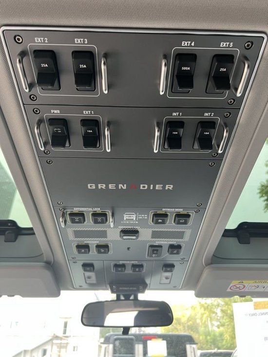 英力士掷弹兵3.0内饰方面,取消了仪表盘的设计,配备12.3英寸中控大屏,下方为空调出风口,而且车内保留了大量的实体按键,两幅式多功能方向盘造型时尚,下方有着密密麻麻的物理按键和旋钮,用于控制灯光、座椅加热、空调调节等功能,越野功能按键如前锁、后锁、越野模式等按钮集成到了后视镜位置,中央通道部分则是机械手刹和宝马的鸡腿挡杆,机械式手刹以及空调控制面板等元素,处处透露着朴素的越野车风格。新车的座椅采用五座设计,座椅由皮革和织物材质拼接而成,并带有简洁的缝线,更具实用性(可选装真皮座椅)。