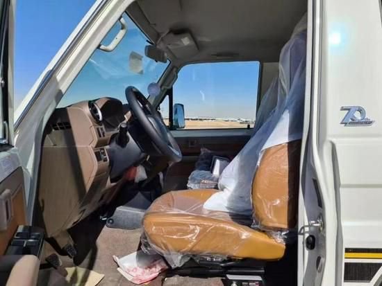 进入车内,我们可以看到全新LC71采用了全新的布局风格,注重舒适性和功能性的结合。皮革材质包裹的三幅式多功能方向盘展现出豪华感与实用性的完美结合。指针式仪表盘清晰易读,提供了全方位的驾驶信息。中控区域悬浮式显示屏的运用使整个内饰更加现代化,并且操作更加便捷。此外,圆形设计的空调出风口与硬朗的车身线条相呼应,完美契合了硬派越野车的风格。