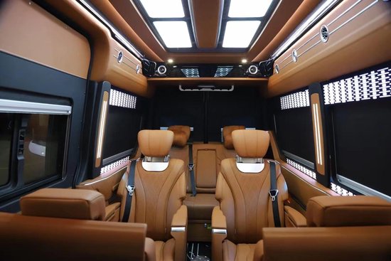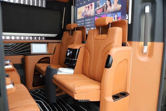 为了方便老人小孩上下车,车侧和车尾都设置了伸缩脚踏板,进入车内,以青灰色包边为主,加上米白色,整体偏冷色系,中排两把米色埃尔法同款座椅,法式线条缝合,立体感、包覆性极强。要说空间大,7座的MPV大布局,在这款车上就体现的淋漓尽致,后排是一个三体式连体沙发床,不仅如此,旁边还留有一个过道,无论你是横躺还是侧躺,都游刃有余,来去自如,更便捷。