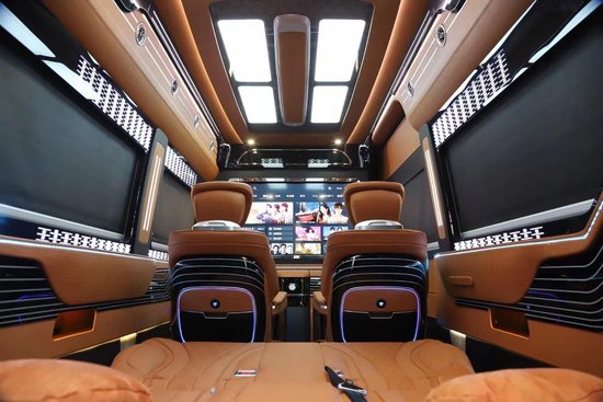 家人出行,后排对坐的一个布局可以当成会客厅、娱乐厅,多功能可以使用,满足不同的场景需求,还能当成休息室来使用,整车内部加装了低音炮以及阿尔派的音响,坐在车内视听感受非常带劲。