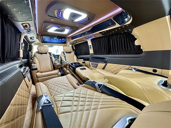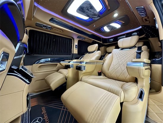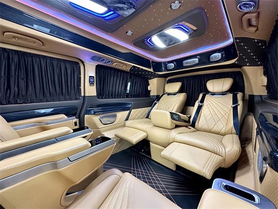 外观方面还是主要以迈巴赫的外观为主,这款外观是最受大家欢迎的一款。迈巴赫同款LED前大灯,比原车的卤素大灯有更好的照射距离,能更好的的保证车辆的夜间行车安全!内饰方面,先看驾驶室,迈巴赫的连屏中控,科技感更强,档次更高,还有一键启动和无钥匙进入系统,必须全部都有安排好。整个中控都是真皮包覆,还带有桃木饰板,还是高光的,靓丽的很。其次,座椅都换成了V260的座椅,门板上可以全方位的调节,还带有通风和加热,中央扶手冰箱也是标配,可以达到结冰的效果。