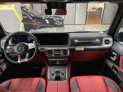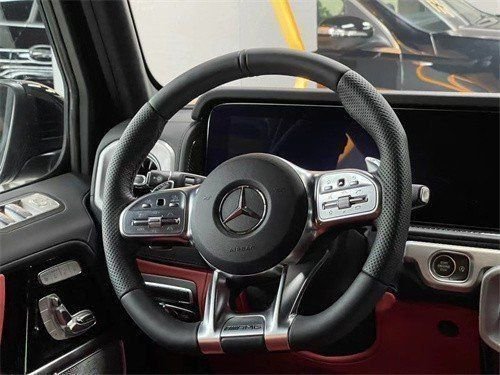 23款奔驰G63 (配置|询价)车内越野气息十足,多处硬朗设计使其具有硬派越野车风格。采用现下流行的双连屏设计,让车内还具有一些科技感。双连屏界面显示清晰,易读性不错。方向盘为三辐式式设计,除了常见的功能按键区域之外,还在下方加设了一些按钮,驾驶仪式感十足,也可以让驾驶员专注力提升,不分神去操作其他功能。方向盘支持各种导航、电话、以及娱乐功能的控制按键。中控区域还采用了AMG车型独有的模拟时钟IWC设计,时钟中的数字和指针均采用纯金属材质,质感不错。