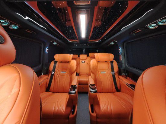 迈巴赫车顶灯光,衬托奔驰V250的独特之处。车顶前舱天窗设置,后舱车顶长方形灯光,立体感十足。LED温馨氛围灯、内饰灯、壁灯,照耀整个车舱,即使黑暗,也无惧。隐藏座椅可通过贵宾座椅旁的总裁控制屏一键控制,隐藏中间为一台隐藏电动商务桌,出行时与随行人员讨论企业方案或是进行项目都十分方便。掀开电动隐藏商务桌上方的黑色盖板,可看到一台进口咖啡机,后排座同等规格设计,中央设计了一个宽大的扶手并配有一块液晶控制屏可控制座椅的多向调节、氛围灯、空调等功能。