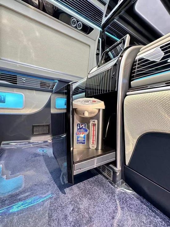 后排座是一张采用相同皮质的3人座沙发,坐感同样舒适,只需轻轻一按,在10秒钟的时间,它可以变成一张1M7*1M4的双人床,通过和前排座椅的对接,长度可以达到2M2,当然,相信后部座椅可以平放成床这样的设计很多商务车都采用,但奔驰的这张床,请仔细看,它并没有完全放平,这就是奔驰高科技和人性化的完美结合