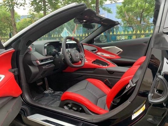 23款科尔维特C8敞篷 内饰部分采用了环抱式中控设计,中控台几乎将所有的控制按键和旋钮放置在了驾驶员右侧的面板上,并且全部朝向驾驶位置。此外,新车采用全液晶仪表盘与中控多媒体显示屏的连屏设计