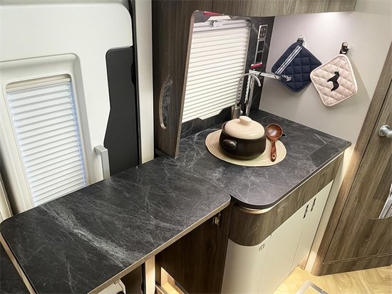 ;厨台配备洗菜池,标配小米净水器、鹅颈水龙头与定制水槽,车内车外共用双向抽屉(配备碗碟架),左侧超长延伸板触发更多烹饪可能性,上方含有弧面储物柜和嵌入式微波炉,右侧还有部分储物空间。厨房顶部是行车冷风的出风口,同时还配备了微波炉等厨房设备。