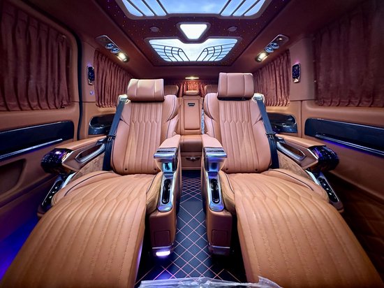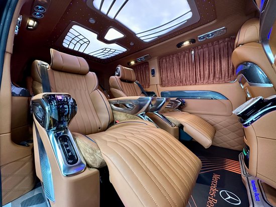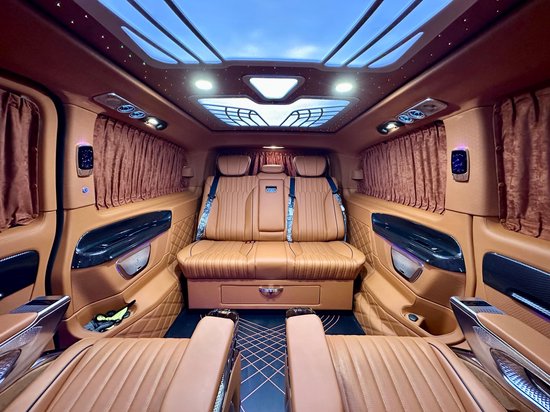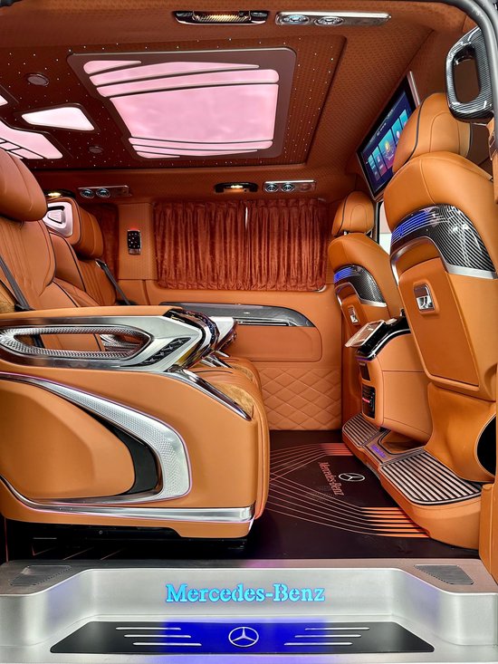 奔驰威霆房车车身尺寸为:5370*1928*1920mm,(_详情垂询:l33-2195-6679_)使车内空间更高,坐在车内不会有压抑的感觉。加长3400的轴距,不止是大空间内舱的最直接体现,更为舱内的升级提供了优良的底盘基础。这台7座定制版的威霆内饰非常有特色,车舱内部米蓝色与棕色的内饰搭配,大量真皮包覆车壁,地板也采用了经典商务车改装所运用的实木镜面地板,亮白的迈巴赫氛围灯,带来豪华高雅的氛围。