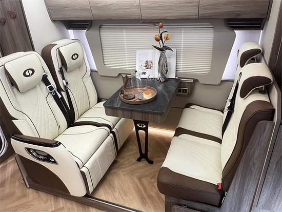 和以往的代际产品不同的是,2023款E途Pro Max拓展舱对应的会客区由常规卡座换成了2航空行政座椅+2商务座椅的配置,更加注重乘员的舒适性体验。超前前方的航空座椅带有通风/加热功能,后背按摩,腿托,座椅角度调节等等全部配齐。再者,戴德房车向来在旗舰产品上都喜欢安装Nappa材质包覆的座椅,真皮打孔方便通风和加热坐垫。座椅中间的餐桌这次的属性似乎转换成了偏向茶台的功能,可以延伸桌面,增加一部分空间。