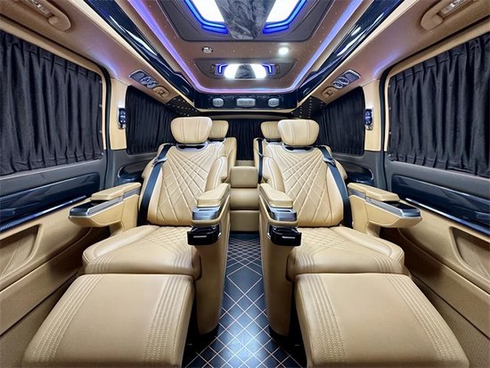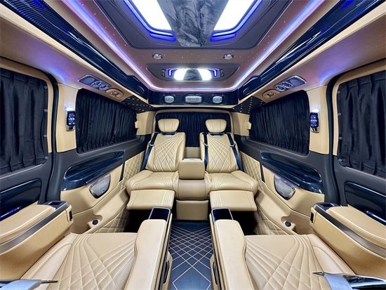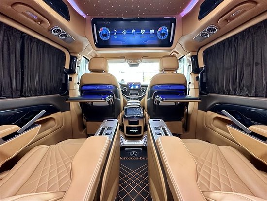 外观方面还是主要以迈巴赫的外观为主,这款外观是最受大家欢迎的一款。迈巴赫同款LED前大灯,比原车的卤素大灯有更好的照射距离,能更好的的保证车辆的夜间行车安全!内饰方面,先看驾驶室,迈巴赫的连屏中控,科技感更强,档次更高,还有一键启动和无钥匙进入系统,必须全部都有安排好。整个中控都是真皮包覆,还带有桃木饰板,还是高光的,靓丽的很。其次,座椅都换成了V260的座椅,门板上可以全方位的调节,还带有通风和加热,中央扶手冰箱也是标配,可以达到结冰的效果。
