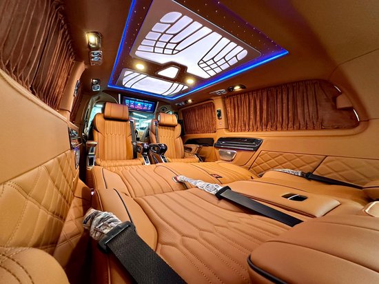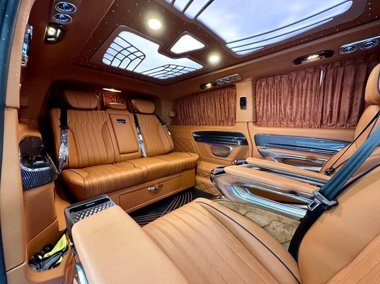 奔驰威霆房车车身尺寸为:5370*1928*1920mm,(_详情垂询:l33-2195-6679_)使车内空间更高,坐在车内不会有压抑的感觉。加长3400的轴距,不止是大空间内舱的最直接体现,更为舱内的升级提供了优良的底盘基础。这台7座定制版的威霆内饰非常有特色,车舱内部米蓝色与棕色的内饰搭配,大量真皮包覆车壁,地板也采用了经典商务车改装所运用的实木镜面地板,亮白的迈巴赫氛围灯,带来豪华高雅的氛围。