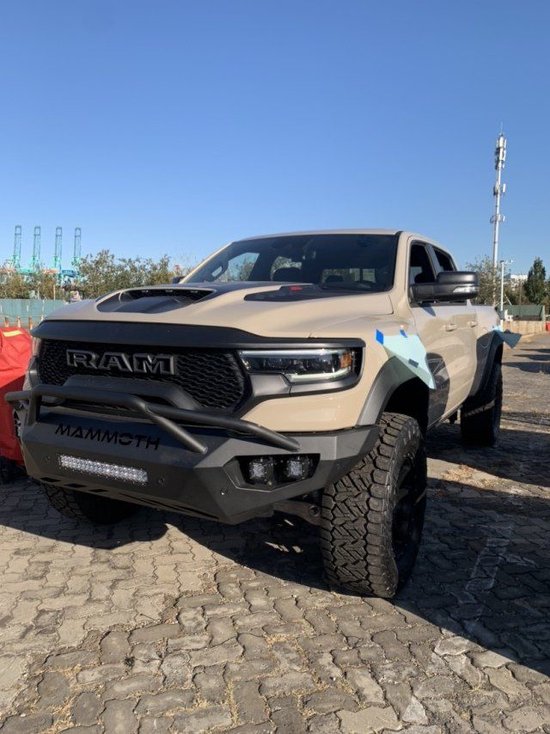 道奇猛犸象进行了升高处理,采用定制的竞技前杠、配以20英寸防脱越野轮毂和35英寸的越野轮胎。动力搭载经过升级的6.2L机械增压发动机,最大可输出754kW,峰值扭矩1313N·m。