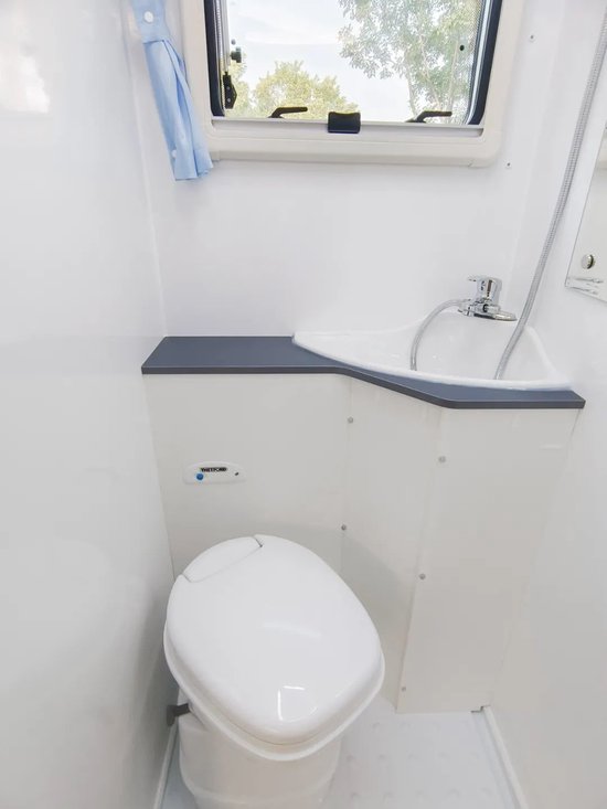 卫浴间为干湿一体式设计,卫浴系统配置了双向换气扇,能够帮助卫浴间快速换气,保证内部空气流通,此外还配备有淋浴花洒、毛巾杆、化妆镜、房车马桶等全套设施。