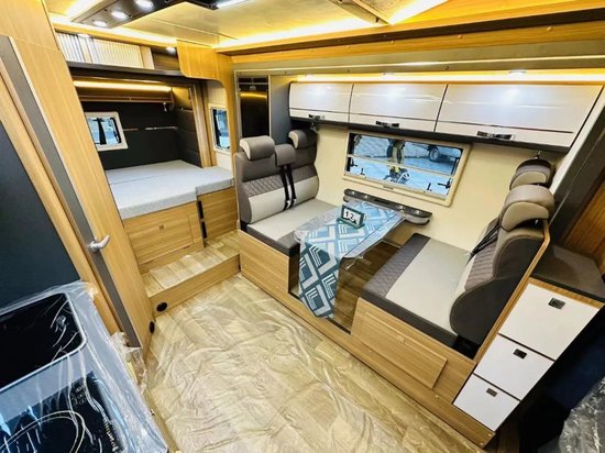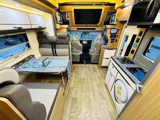 云游双拓展房车侧拓展一侧为会客区,符合人机工程学设计的卡座区域采用了四人对坐的形式,独立的头枕和三点式安全带保证行驶时旅客的安全。卡座轻松放下变成一张床暖色调灯光,多种灯饰随心组合温馨的时光由自己创造。设计风格与车内其他部分相呼应。卡座顶部安装了三个大型吊柜,并在后方安置了房车专用150L大容积直流冰箱。