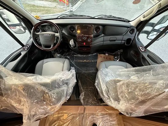 云游双拓展房车驾驶室内,主副驾驶座椅更换为带打孔的皮质座椅,通风性能更好。米色+灰色的撞色搭配设计,看起来非常的精致,乘坐舒适性也达到了一流水平。 红木风格方向盘增添舒适手感,中控大屏让车辆出行更加智能。