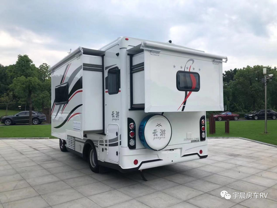 云游双拓展房车的备胎放置在车尾左侧,保护罩带有云游标志,更具个性。尾灯采用了独立的组合尾灯设计,力求在简约中体现不简单,顶部还设置有高位倒车影像,是设计感和功能性的完美融合。