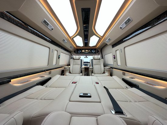 整车车内饰米色为主,作为一款商务车,米色内饰一向是人们所钟爱的一款,与其相匹配的是侧墙也是米色包覆,还有电动的百褶窗帘,地板也是大理石的递盘,浅色内饰看起来很舒心,顶部是多款颜色可以调节的顶灯,没有太花哨的颜色,有的是温馨,稳重的款式。