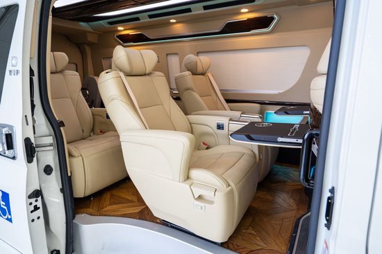 这台海狮整车升级了加强型的隔音隔热处理,车内带空气净化系统,无线充电系统。在进门侧加装了氧化铝脚踏带迎宾灯的,整车都是采用纳帕级皮质进行包覆的,侧壁红木装饰,手动百褶窗帘,后舱暖风系统,最后说说棚顶灯光,这个有智能触摸控制系统。灯光超级棒。
