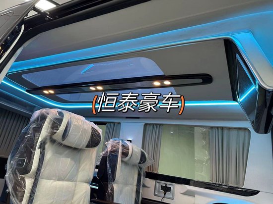 此款内饰颜色采用简洁的白咖双拼配色,简单而不失豪华,更适用商务洽谈出行。后舱两张豪华航空座椅,依据亚洲人身体形态定制而来,全部采用进口小牛皮包裹,填充物十分柔软。手枕处更选用了更为珍贵的鸵鸟皮皮质,天然的圆点与细腻的皮质给乘客足够的舒适感。 功能上航空座椅配有多向调节、加热通风、舒适腿托、电动电脑桌配套等高等级座舱实用功能。后排沙发床也可以随时电动放平,让车主享受旅途也享受生活。