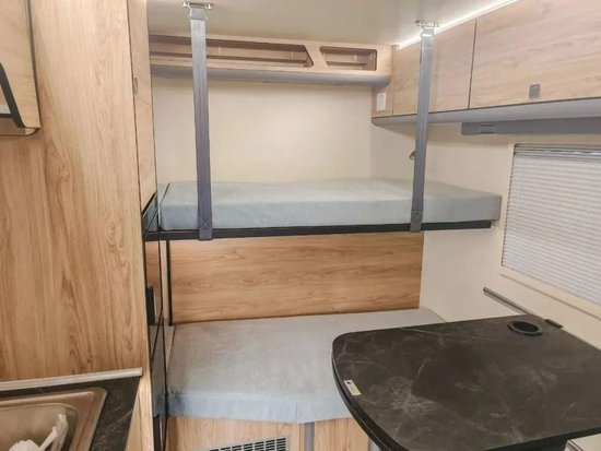 夜晚休息时,卡座区可以拼成一张临时床铺使用,此外,座椅的上方隐藏有一张升降吊床,驻车时整个区域可以形成上下铺的形式。
