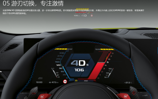 内饰部分是此次改款的一大看点,据悉,新款宝马M3换装了家族最新的曲面双联屏,并内置iDrive 8车机交互系统,科技感大幅提升。另外,车辆的仪表内部还提供了M专属仪表主题,进一步突出M特质,您可以通过方向盘上的红色M1/M2按钮实现一键切换,享受宝马M带来的专属乐趣。