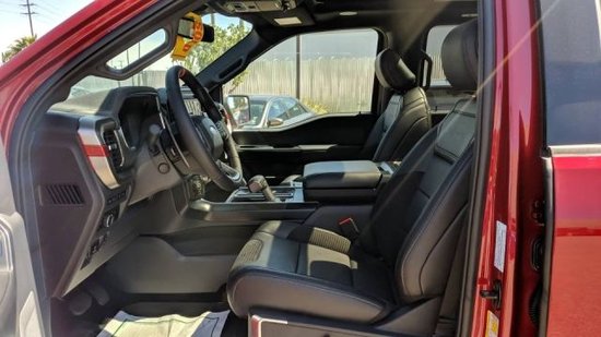 福特猛禽F150的内饰采用独特的中控台和门饰板面漆和真皮包裹的方向盘,方向盘可以上下前后调节。轴距3690mm,拥有宽敞的内部空间, 全车蓝黑搭配的电动调节真皮座椅,用豪华舒适来形容一点也不为过。