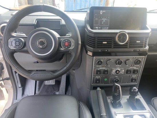 内饰方面,取消了仪表盘的设计,配备12.3英寸中控大屏,下方为空调出风口,而且车内保留了大量的实体按键,两幅式多功能方向盘造型时尚,下方有着密密麻麻的物理按键和旋钮,用于控制灯光、座椅加热、空调调节等功能,越野功能按键如前锁、后锁、越野模式等按钮集成到了后视镜位置,中央通道部分则是机械手刹和宝马的鸡腿挡杆,机械式手刹以及空调控制面板等元素,处处透露着朴素的越野车风格。新车的座椅采用五座设计,座椅由皮革和织物材质拼接而成,并带有简洁的缝线,更具实用性(可选装真皮座椅)。