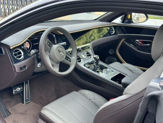 23款欧规宾利GT 鲸黑/亚麻,马鞍棕 现车手续齐 4.0TV8发动机 8速双离合速箱 黑色钢琴烤漆内饰 22寸Mulliner双色轮毂 1、Mulliner驾驶包 (22\\\\\\\“寸双色轮毂,座椅缝线,门板等面板处菱形格纹缝线,运动脚踏板,加油盖特殊饰面,宾利盾徽刺绣,金属油箱盖) 2、城市包 (顶视相机 交通标志识别、城市行驶辅助、行人警告、倒车警告、自动防眩光 后视镜) 3、前排座椅舒适包 (电动调节座椅,座椅通风、加热和按摩功能) 4、旅行包 (HUD抬头显示、夜视系统、宾利安全系统升级版、ACC自适应巡航、车道辅助系统)5、座椅缝线撞色缝线6、盾徽刺绣撞色盾徽刺绣7、三辐可加热多功能方向盘8、氛围灯