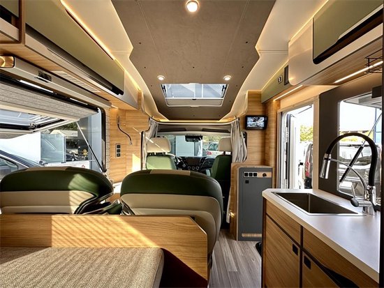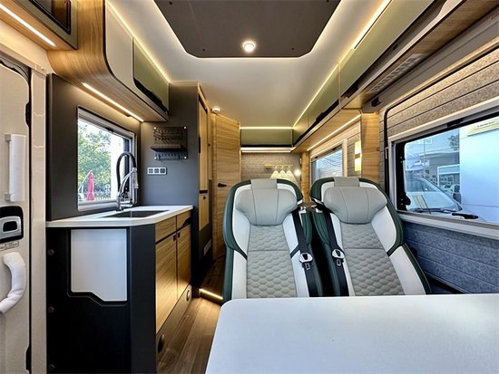 进入生活区的方式有两种,一是从驾驶舱的贯通式过道进入,另一种便是通过房车专用乘客门了;生活区由会客区、厨房区、卫浴间及尾置纵床组成,生活设施一应俱全。会客区位于驾驶区后方,采用双人并排卡座设计,配备了两张保姆车级别航空座椅,座椅提供电动调节、座椅通风加热、按摩及腿部支撑功能,提升了乘坐舒适性;在座椅的前方设有一张可拆卸餐桌,餐桌上方设有多组220V/USB充电接口,可支持多电器同时用电;且驾驶舱内的主副驾驶都可以进行180度旋转,与后方形成了更宽裕的会客空间。