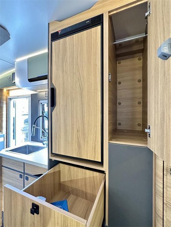 戴德URV房车厨房区域位于卡座区域对面,采用高档木材以及FORMICA台面构成。其上方配备了带大范围抽拉水龙头的大尺寸水槽,并设计有侧面翻折桌板,用于拓展工作区。匹配的电气配置达到48V5000W逆变器+48V 250AH 锂电池+ 600W 太阳能板,续航能力极佳。戴德URV房车尾床采用纵置式设计,带有扩展区域,扩展后的内部尺寸可达到1200*2000mm。侧边采用软包设计,灰色墙面+LED照明塑造出更加高端的感觉。