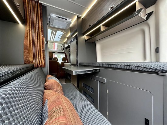 驾驶舱配置了三张座椅,会客厅则搭配的是单排双人座椅,整车可同时实现5人乘坐,增大了核载人数。另外,会客厅区域还配置了一张可折叠、拉伸的餐桌,不仅是办公还是就餐,都能够轻松满足车友的使用需求。旁边还配有推拉窗的设计,即使在行车时也可以打开使用。