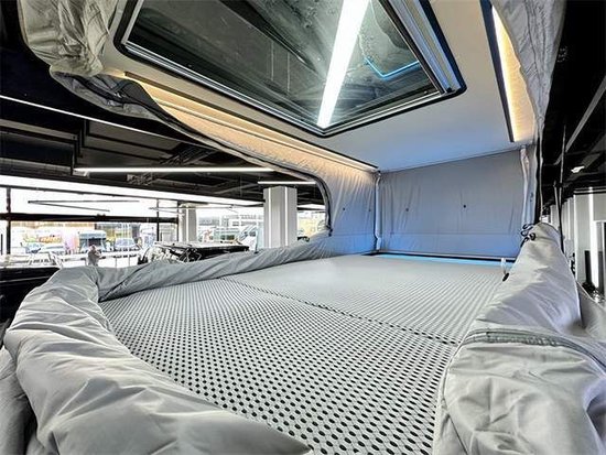 对于这款房车,比较重要的就是车顶的升顶机构了。它采用X型剪式升顶机构设计,不仅具有很好的稳定性,而且抗风能力和结构强度都很大。根据瑞弗的相关实验数据显示,它可以负载150kg,能够实现万次的开合,因此这套升顶机构还是非常强的。