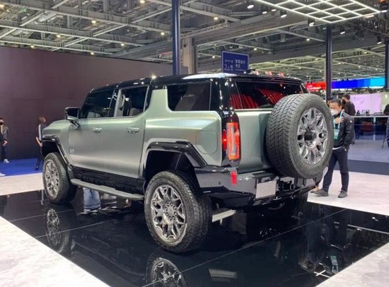 侧面来看,全新悍马EV SUV采用了方正的造型,巨大的车身轮廓体量感很强,突出于车身的轮眉看上去相当有力量,而且延续了高腰线窄车窗的设计,勾勒出高大威猛的效果。另外,在2022进博会展示的新车还采用了可拆卸式的车顶配合尺寸夸张的越野轮胎,视觉效果非常震撼。