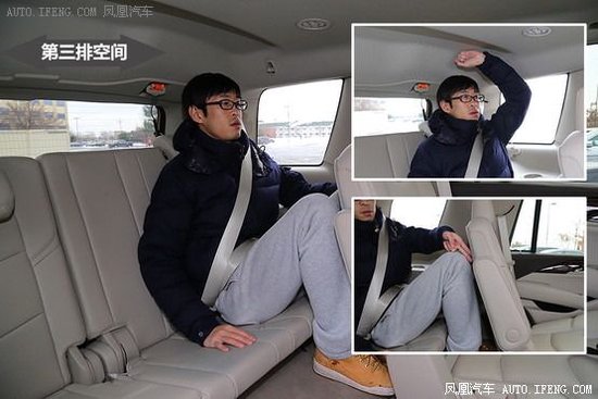 在体验完第二排空间后,我们来到了第三排空间,与那些尺寸较小的七座都市SUV相比,凯雷德的第三排绝不是摆设,即便你的第二排坐了乘客,第三排也依然可以坐下一位身高在180厘米左右的乘客,只是由于地板较高,所以在坐姿方面其不如第二排那样舒适罢了。