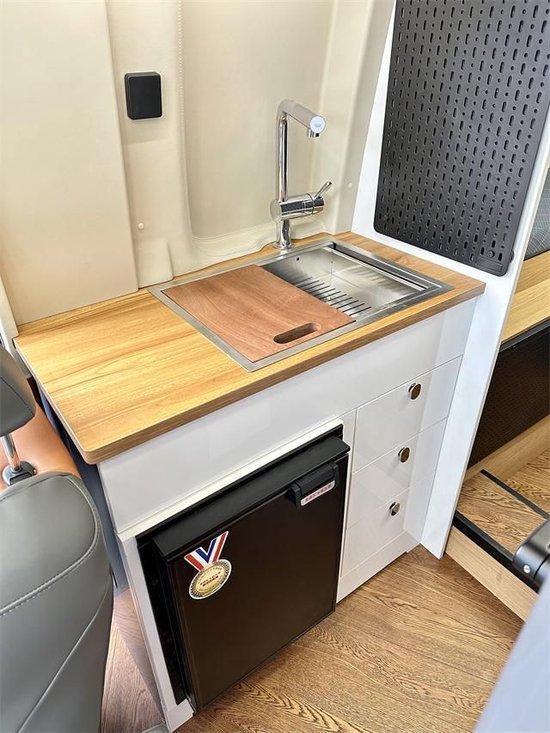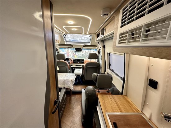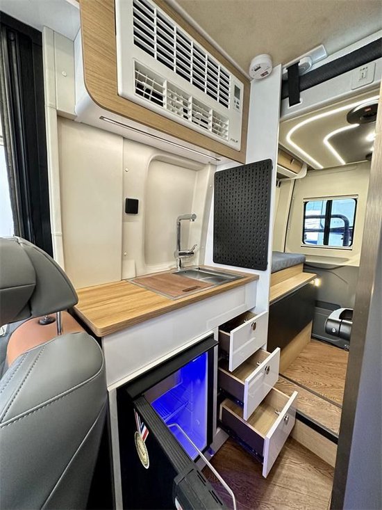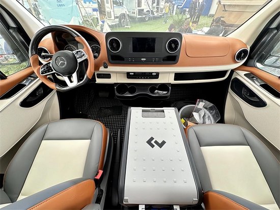 车内厨房区域虽然不大,却功能齐全,电磁炉随车带走,随时用不受区域限制,房车专用50L冰箱,和前面的扶手冰箱加起来就是75L的容量了。还有行车驻车两用的分体直流变频空调,和进口伟巴斯特独立燃油加热器,配置全面的很。