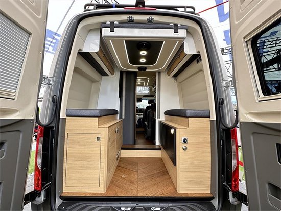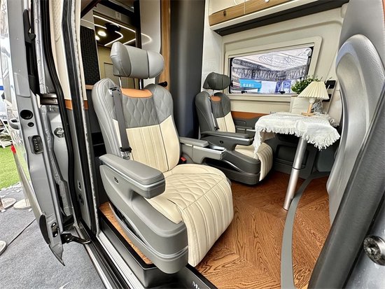 车内也有超大曲面双层亚克力全景天窗,顶部的灯光和氛围灯也是按照商务车的标准来做的,力图满足旅居用途的同时也能享受商务车的高级舒适感。