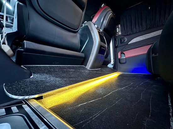 这款车的第三排是三联排的沙发床,可以180度的进行平躺,最后一排可以乘坐三人。日常出行想在车内休息一下,还是很惬意的一件事。
