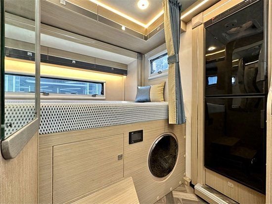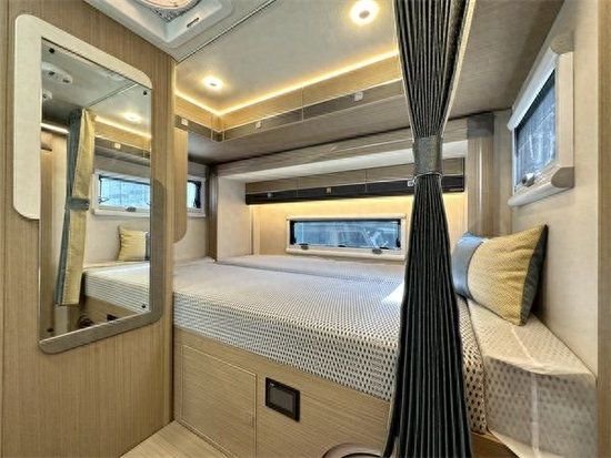 来到车内,我们可以看到,V820采用双拓结构,即房车左侧与车尾均配置空间拓展机构,这样,驻车时的布局和人员流动并不会显得太过于拥挤,车内空间实现最大化,全车车内采用E0级环保标准房车家具板材,配色上更为高级,深色系选材质感十足,额头双人床周边配有对立式车窗和顶置天窗,通风采光性都很不错,隐私床帘可保证床铺私密性,底部为隐藏式40寸互联网液晶电视,电视与室内JBL环绕立体声音响系统匹配链接使用,娱乐影音全互动,增加户外生活体验。给人的第一感觉就是低调奢华有内涵,有木有!