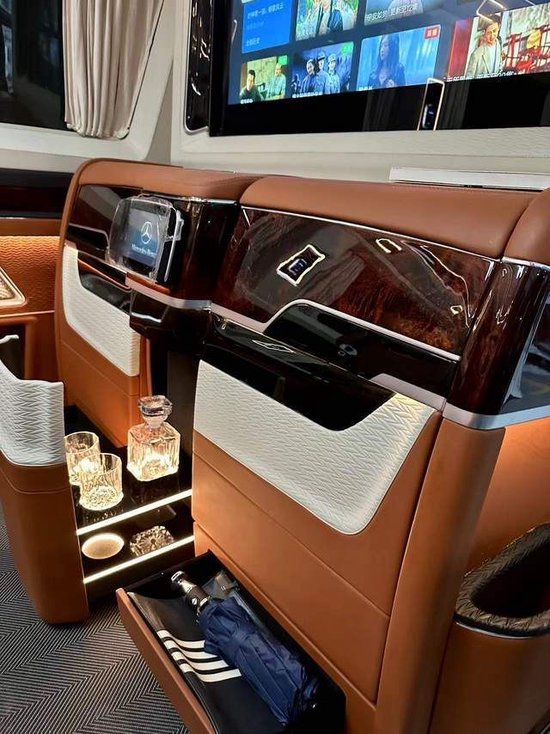 后排折叠沙发座椅,可坐下三名成年人或者两名超级胖纸。困顿时,调节好座椅位置,把后排座椅平躺成床,车厢瞬间就变成暖暖的卧室。在后排二座的斯宾特专属航空头等舱座椅上,我们可以看到,无论是座椅的头枕还是搭配的抱枕上,都用上了云锦。在车壁的两侧也都有着云锦的痕迹,这让奔驰斯宾特房车的整体的国风韵味更甚。再加上座椅本身自带的多向调节,通风加热等多种人性化功能。只能用“堪称极品”四字来形容