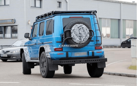 尾部备胎架看起来更加结实,底部保险杠设计被黑色伪装胶带覆盖。还配备了越野用巨大轮胎,同样被黑色伪装胶带遮挡。